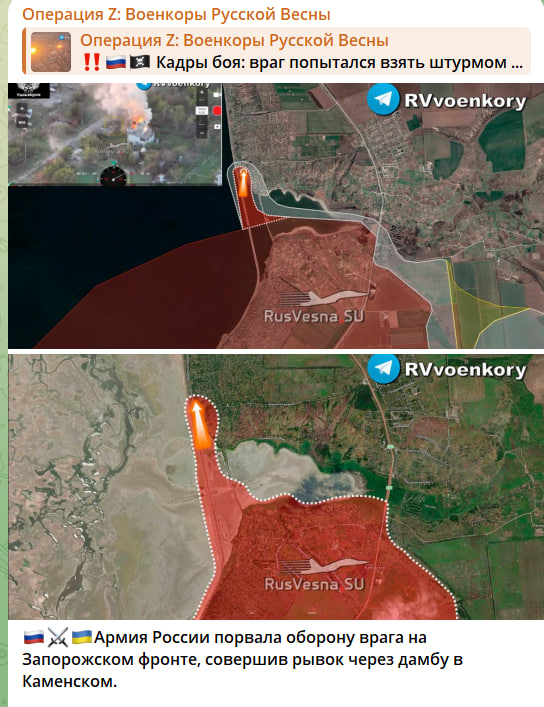 Нельзя не отметить и успехи нашей армии на Запорожском направлении. Ранее поступила информация, что враг попытался взять штурмом наши позиции в Каменском. При этом враг попал в засаду – уже через несколько часов появилась информация, что наши бойцы совершили рывок через дамбу в Каменском.