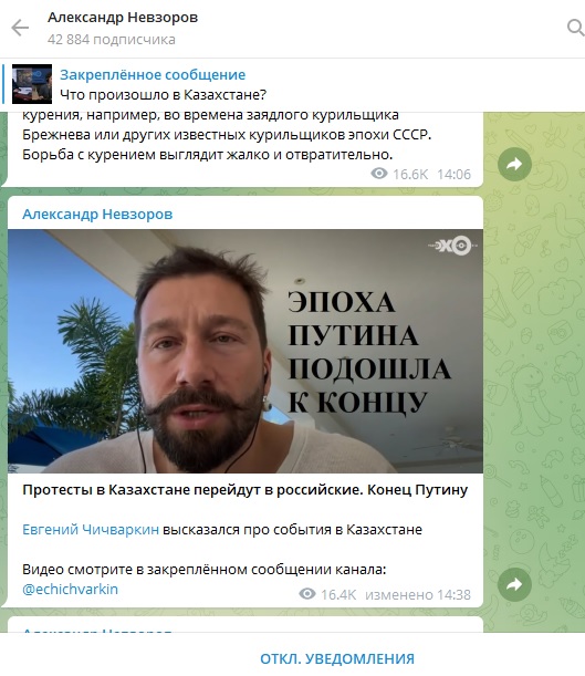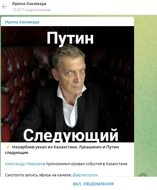 В ворохе информации о событиях в Казахстане мы наткнулись на примечательную рекламу телеграм-канала журналиста Александра Невзорова. Размещена она была в канале политика Ирины Хакамады - то ли по контракту, то ли по старой дружбе, об этом история умалчивает. В рекламе канала на фотографии Александра Невзорова размещена угроза: "Путин следующий". А дальше небольшое разъяснение: