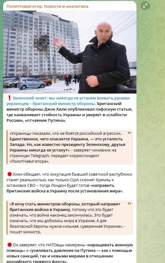 Чтобы ещё подбодрить Киев, Хили обещает "усиливать давление на Путина", анонсируя при этом дальнейшее усиление мощи НАТО. Британский министр анонсировал как введение новых санкций, так и следующие атаки на русский теневой флот.