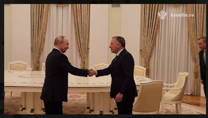 Владимир Владимирович жмёт руку Уиткоффу в Кремле. Скриншот: Телеграм-канал "Царьград"