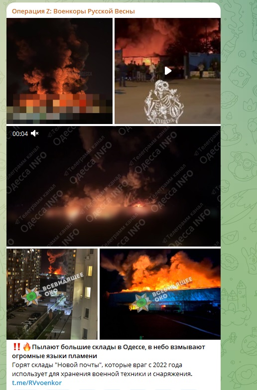 Пылают большие склады в Одессе, в небо взмывают огромные языки пламени… Горят склады "Новой почты", которые враг с 2022 года использует для хранения военной техники и снаряжения,