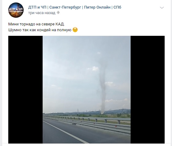 Свидетели природного явления уточнили, что сняли его на видео, двигаясь по КАД. Согласно их описаниям, в полях вблизи Мурино воздух неожиданно закрутился в огромный столб пыли. При этом, судя по кадрам, грозовых туч, характерных для торнадо, над вихрем не наблюдалось.