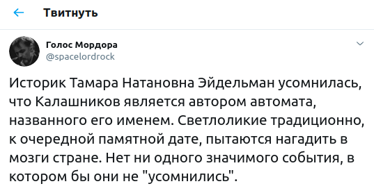 "Историк Тамара Натановна Эйдельман усомнилась, что Калашников является автором автомата, названного его именем. Светлоликие традиционно, к очередной памятной дате, пытаются нагадить в мозги стране, - считает "Голос Мордора". - Нет ни одного значимого события, в котором бы они не "усомнились".