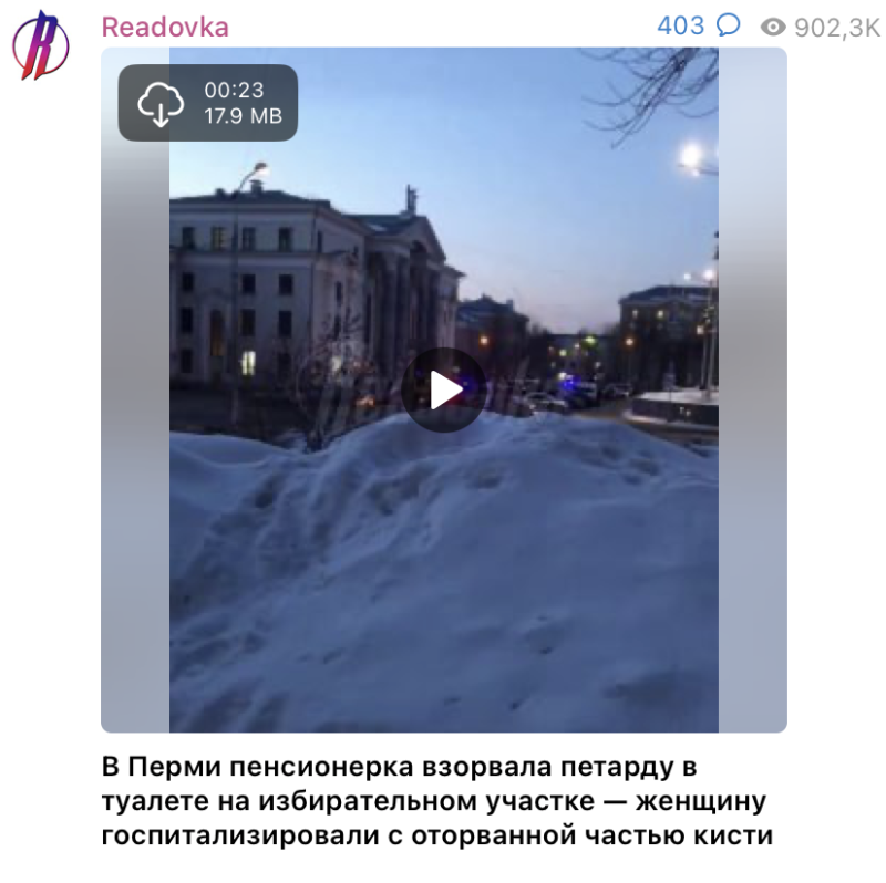 Инцидент произошёл во время выборов. К концу дня в здание ДК Солдатова в Перми вошла пожилая женщина, изучила списки кандидатов и ушла в туалет. Там она взорвала петарду.