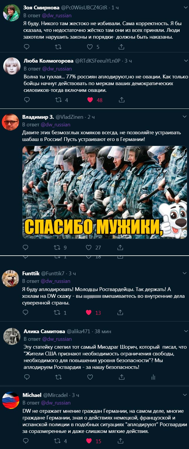 "DW не отражает мнение граждан Германии, на самом деле многие граждане Германии, зная о действиях немецкой, французской и испанской полиции в подобных ситуациях, "аплодируют" Росгвардии за соразмеренные и даже слишком мягкие действия", - добавил пользователь Michael.