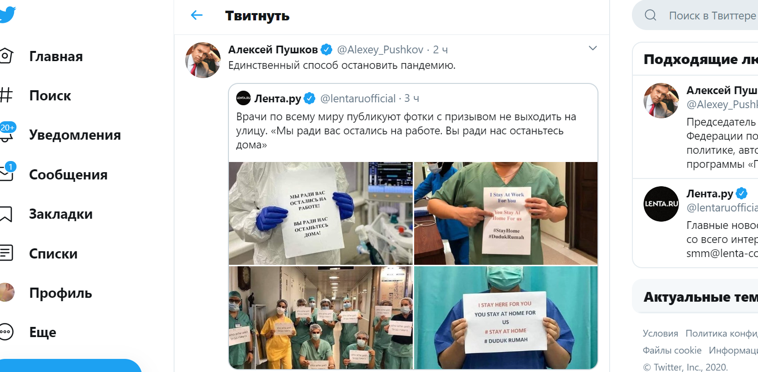 По словам сенатора Алексея Пушкова, который отметил этот пост в Twitter, такой призыв - "единственный способ остановить пандемию".