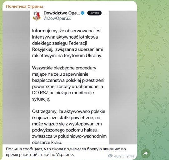 Пока Незалежную трясло от взрывов, вздрогнула Польша. В военном командовании признались, что во время атаки русских ракет там снова подняли военные самолёты в небо. Полетали-полетали да и вернулись на места.