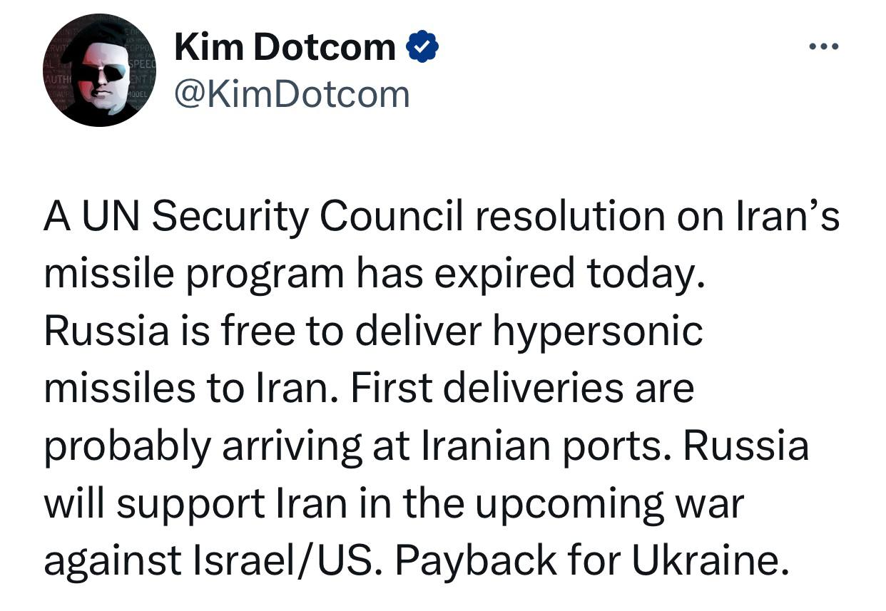 Немецкий интернет-предприниматель и политический активист Ким Дотком напомнил на личной странице в социальной сети, что как раз сегодня истёк срок действия резолюции Совета Безопасности ООН по ракетной программе Ирана. И для США в связи с этим не самые приятные новости...