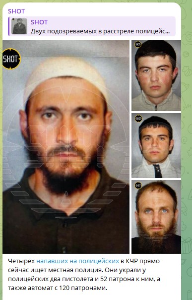 По данным SHOT, УАЗ с тремя полицейскими в Карачаево-Черкесии расстреляли боевики в упор. Напавшие палили из автомата по окнам и дверям авто, а сразу после преступления они забрали всё оружие сотрудников МВД и уехали в сторону гор.