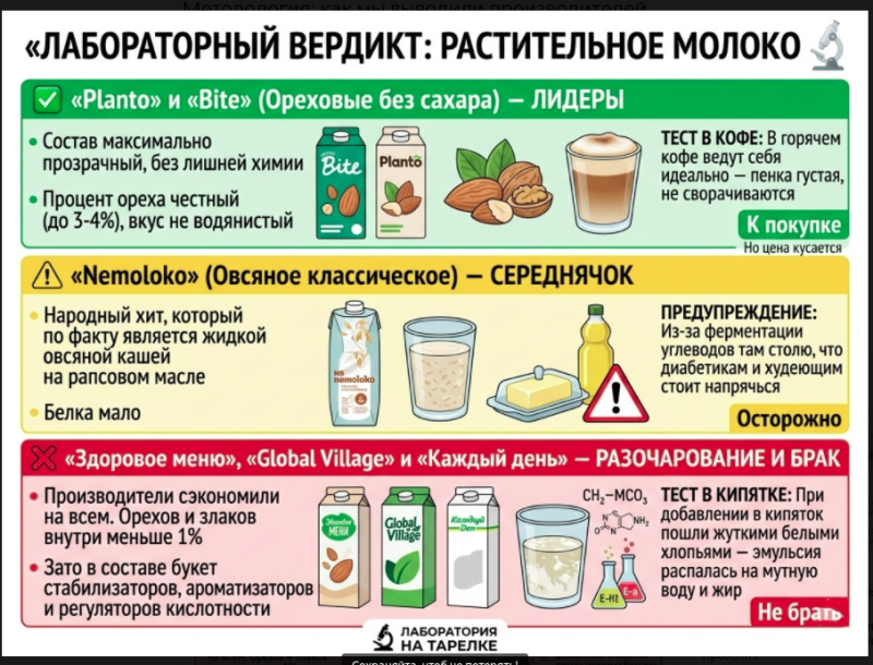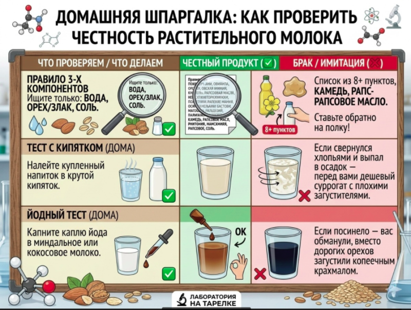 Авторы дзен-канала констатировали: "Нас с вами гениально водят за нос!" А также предложили шпаргалку, которая поможет проверить качество растительного молока дома самостоятельно.