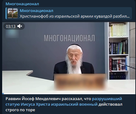 Извинения Израиля за осквернение статуи возмутили раввина Йосефа Менделевича. Говорит, всё было по заветам Торы. И назвал изображение Спасителя "поганью".