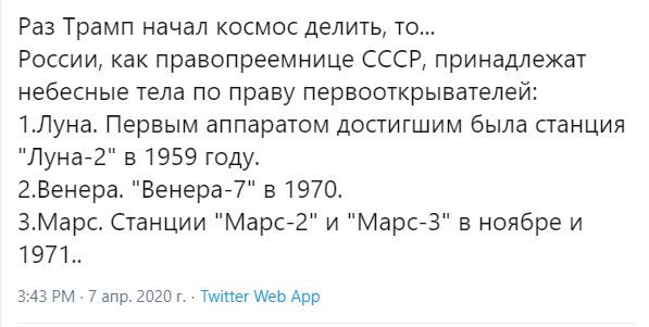 "Раз Трамп начал космос делить, то... России как правопреемнице СССР принадлежат небесные тела по праву первооткрывателей", - сказано в другом твите "Уругвайской разведки".