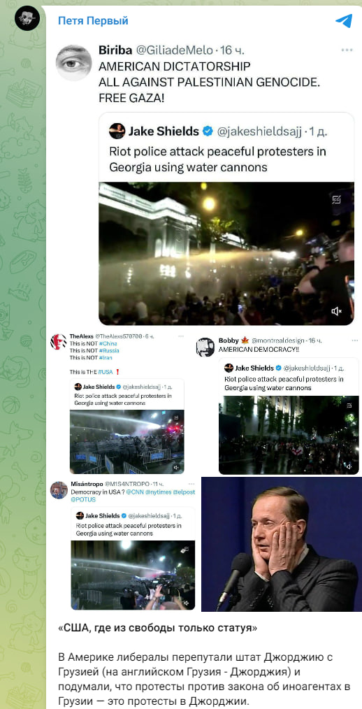 "Американская демократия?" - с негодованием написал пользователь соцсети X, выражая своё возмущение разгоном протестов в Грузии. Всё дело в том, что комментатор, а вместе с ним и ещё несколько "одарённых" либералов, перепутали Грузию с Джорджией, американским штатом.