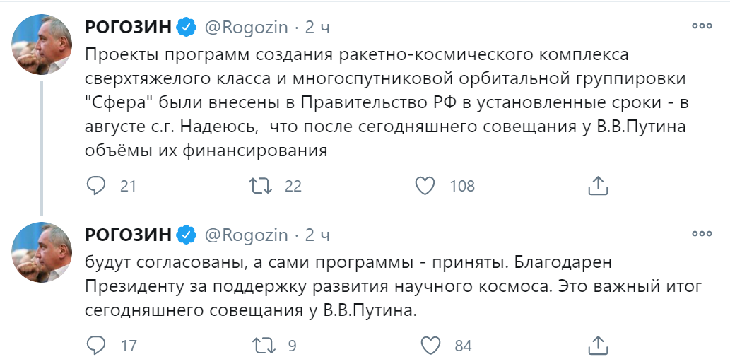 Благодарен президенту за поддержку развития научного космоса. Это важный итог сегодняшнего совещания у В. В.Путина, - добавил глава "Роскосмоса" в Twitter.