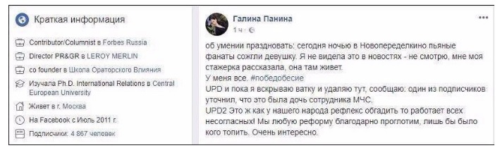 Напомним, что вечером 1 июля в Новой Москве была обнаружена обгоревшая девушка. Как потом стало известно, у нее были ожоги 80% тела. Пока врачи боролись за ее жизнь, в Сети начали распространяться немыслимые слухи о том, что же произошло на самом деле. Так, PR-менеджер компании «Леруа Мерлен» Галина Панина прямо написала, что в произошедшем финоваты «пьяные фанаты».