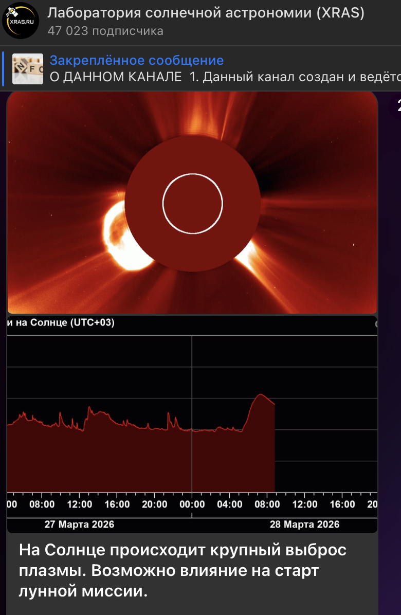 Мощный выброс плазмы с Солнца поставил под удар долгожданную пилотируемую миссию на Луну, намеченную на 2 апреля - первую с 1972 года. Специалисты Лаборатории солнечной астрономии (XRAS) предупреждают: прямого удара по Земле не будет, но корабль на дальних орбитах рискует угодить в гущу солнечного облака, что резко повысит опасности: