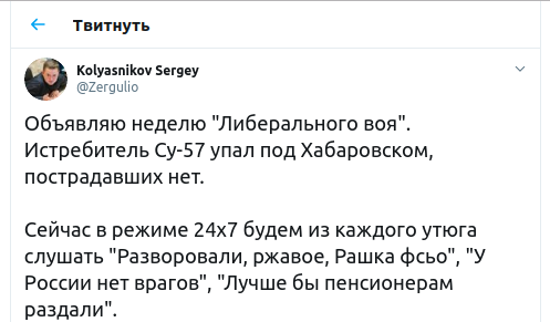 "Объявляю неделю "либерального воя". Истребитель Су-57 упал под Хабаровском, пострадавших нет. Сейчас в режиме 24х7 будем из каждого утюга слушать "Разворовали, ржавое, Рашка фсьо", "У России нет врагов", "Лучше бы пенсионерам раздали"", - заметил блогер Сергей Колясников @Zergulio у себя в Twitter.