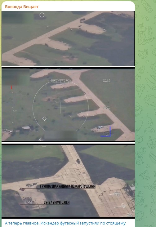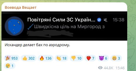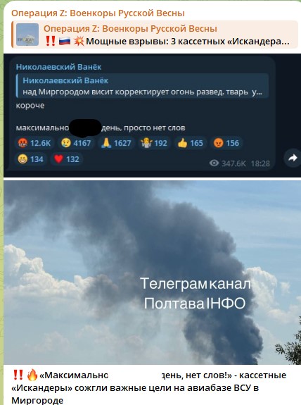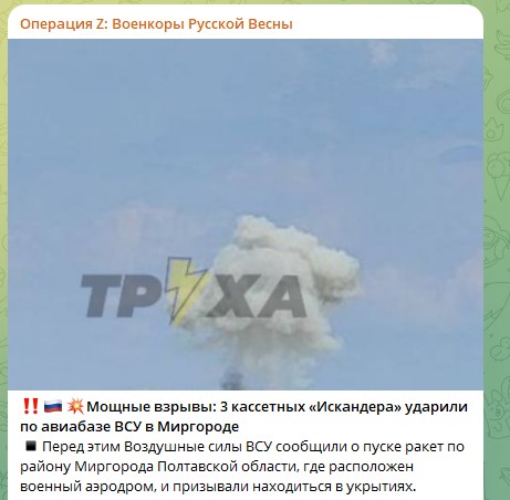 Об ударе "Искандеров" по военному аэродрому в Миргороде стало известно ещё днём, около 15:40 (мск). Примерно в 15:55 русский военный лётчик Алексей Воевода уточнил, что аэродром в Миргороде получил обе посылочки в виде "Искандеров", отметив, что теперь следует ждать подтверждений объективного контроля.