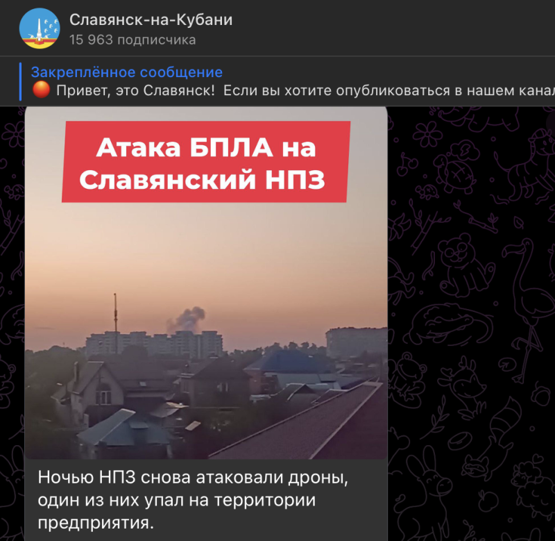 В ходе ночной операции ВСУ предприняли попытку атаковать гражданские объекты в Краснодарском крае, используя беспилотники. Один из остановленных дронов упал на территории нефтеперерабатывающего завода в Славянске-на-Кубани. Ещё один дрон упал в Кущёвском районе Кубани. Впоследствии возникло локальное возгорание, не затронувшее территорию, где живёт население.