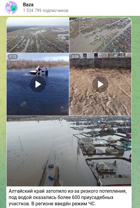 Baza отмечает, что именно "слишком тёплая весна стала проблемой для Алтайского края". "Талые воды стремительно топят дома местных жителей: уже пострадали около 90 домов и 600 приусадебных участков в девяти населённых пунктах, - говорится в сообщении. - Перекрыто восемь участков дорог".