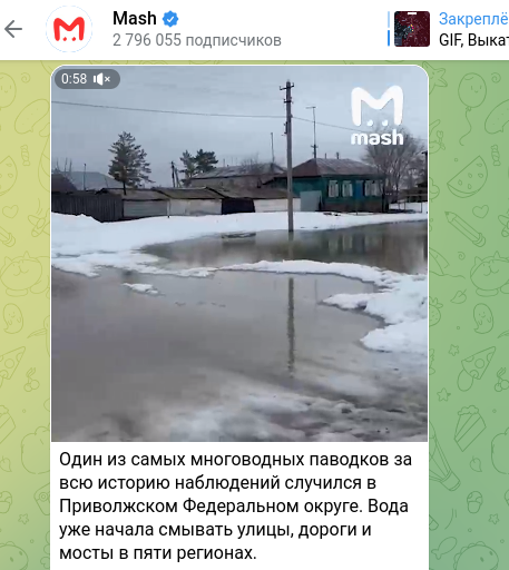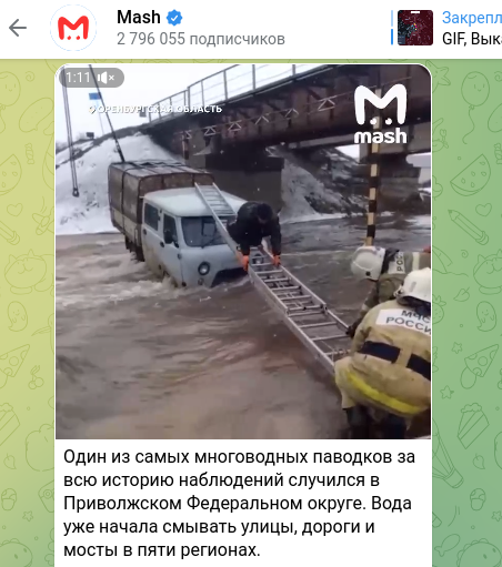 Mash сообщает, что один из самых многоводных паводков за всю историю наблюдений случился в Приволжском федеральном округе: "Вода уже начала смывать улицы, дороги и мосты в пяти регионах".