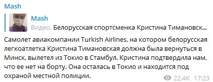 Рейс "для Тимановской" вылетел из Токио в Стамбул, однако атлетки в списке пассажиров не оказалось. Судя по всему, девушка осталась в Олимпийской деревне.
