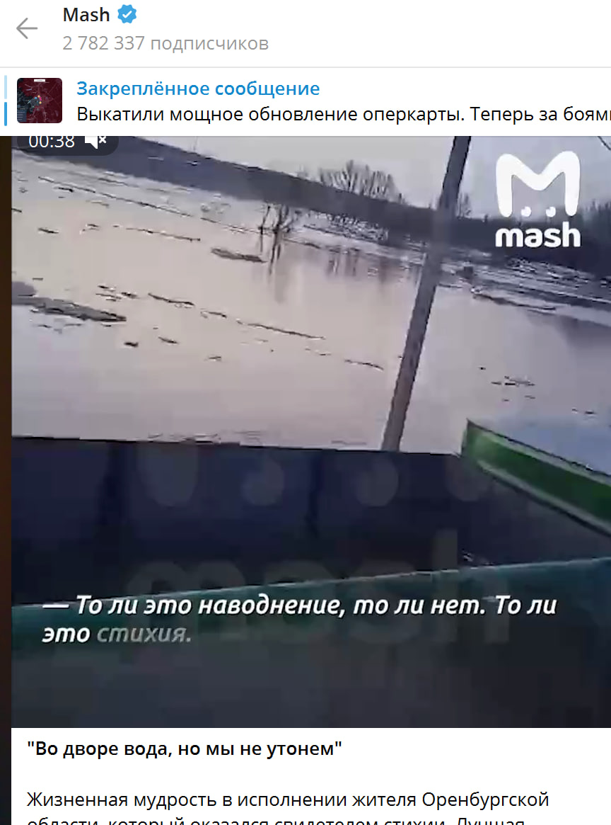 В Сети тем временем завирусился ролик, снятый жителем Оренбургской области, который оказался свидетелем стихии. Он философски заметил: "То ли наводнение, то ли стихия. Везде вода, но мы не утонем, потому что Россию не победить!"