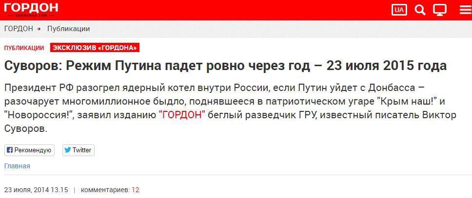 Писатель и историк Армен Гаспарян приводит в своем Telegram-канале скриншот статьи на сайте украинского издания "Гордон", в которой экс-сотрудник ГРУ перебежчик Виктор Суворов (Владимир Резун) предсказывает "падение режима Путина через год". Статья была опубликована 23 июля 2014 года.