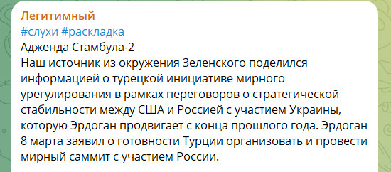 Небратский ТГ-канал "Легитимный" со ссылкой на собственный источник из окружения Зеленского поделился информацией о турецкой инициативе мирного урегулирования в Незалежной в рамках переговоров о стратегической стабильности между США и Россией с участием "страны 404". Утверждается, что эту инициативу продвигает Эрдоган с конца прошлого года. Турецкий президент 8 марта заявил о готовности Турции организовать и провести мирный саммит с участием России.