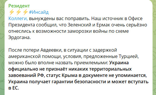 Это сообщение было опубликовано примерно в 11 часов утра по местному времени. И уже через 1,5 часа другой небратский ТГ-канал "Резидент" опубликовал поправку, подтверждающую информацию об инициативе Эрдогана. С одним существенным дополнением.