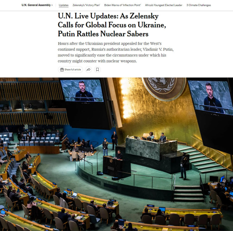 Зеленский, выступавший в среду на Генеральной Ассамблее ООН, активно лоббировал разрешение на использование западного оружия для более глубокого проникновения на территорию России, отмечается в публикации NYT.