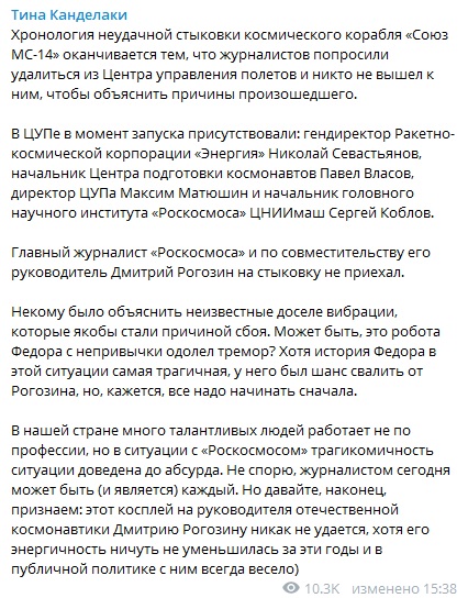 Были и более развернутые комментарии. Например, высказалась телеведущая, журналист и продюсер Тина Канделаки. К слову, довольно критично по отношению к Дмитрию Рогозину.