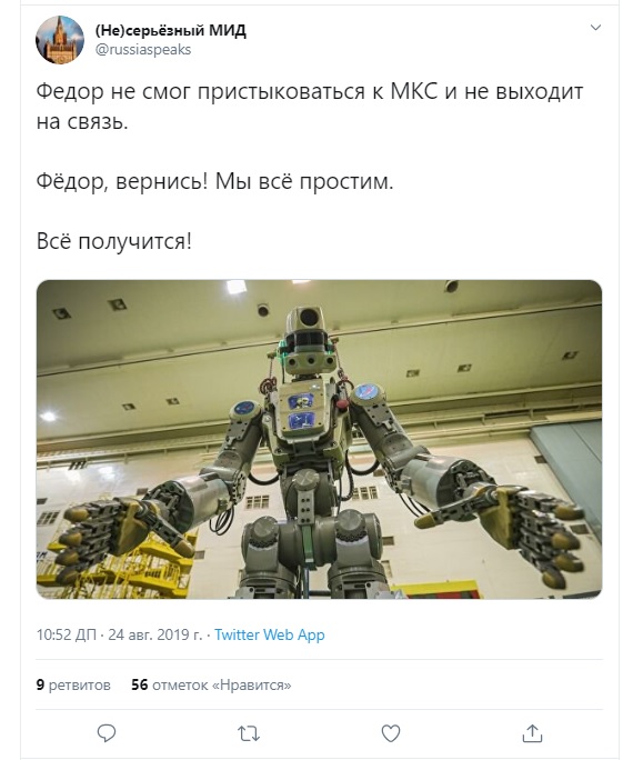 "Эх, Фёдор, загулял, наверное, в космосе. Даже роботы не хотят работать в субботу", - пишет @anrozhn1.