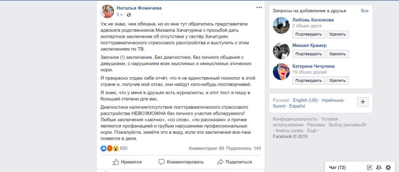 Наталья Фомичёва, возглавляющая центр прикладных исследований "Русское общество психосоматики", рассказала в "Фейсбуке" о сомнительном предложении, которое ей сделали представители адвоката родственников сестёр Хачатурян по их покойному отцу.