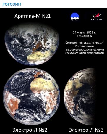 Синхронная съёмка тремя российскими гидрометеорологическими космическими аппаратами, - говорится в подписи к изображению.