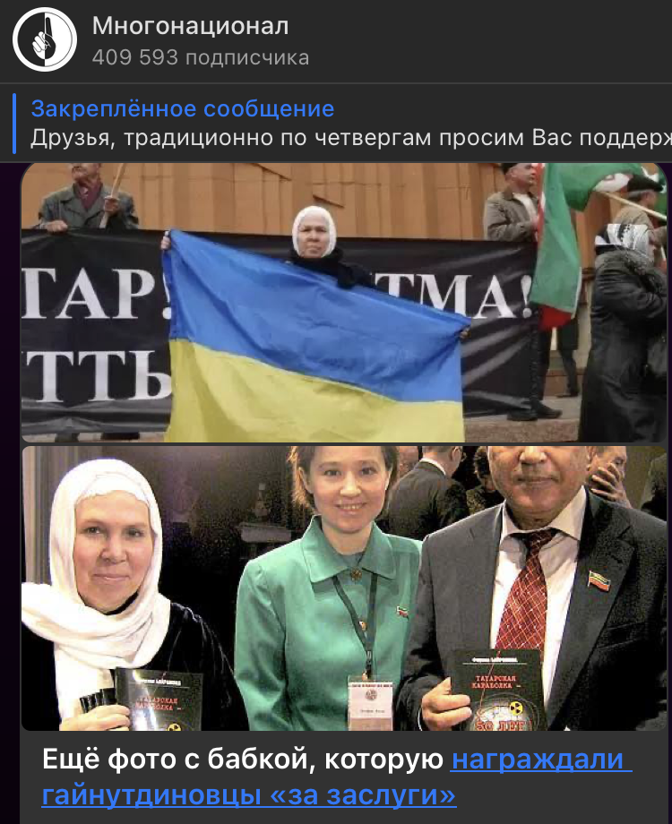 Богословы ДУМ делают героиней сепаратистку, требовавшую отделения Татарстана. В 90-е она призывала к признанию независимости Татарстана. В 2014-м выступала против возвращения Крыма, у неё есть условные сроки за разжигание, и внезапно в ДУМ РФ решили наградить её медалью. Кому это может быть выгодно?