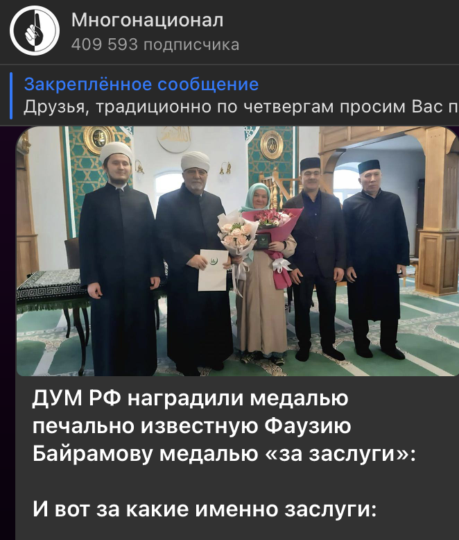 Татарская националистка и известная активистка Фаузия Байрамова получила медаль "За заслуги" от Духовного управления мусульман России (ДУМ РФ), что вызвало широкий общественный резонанс и критику.