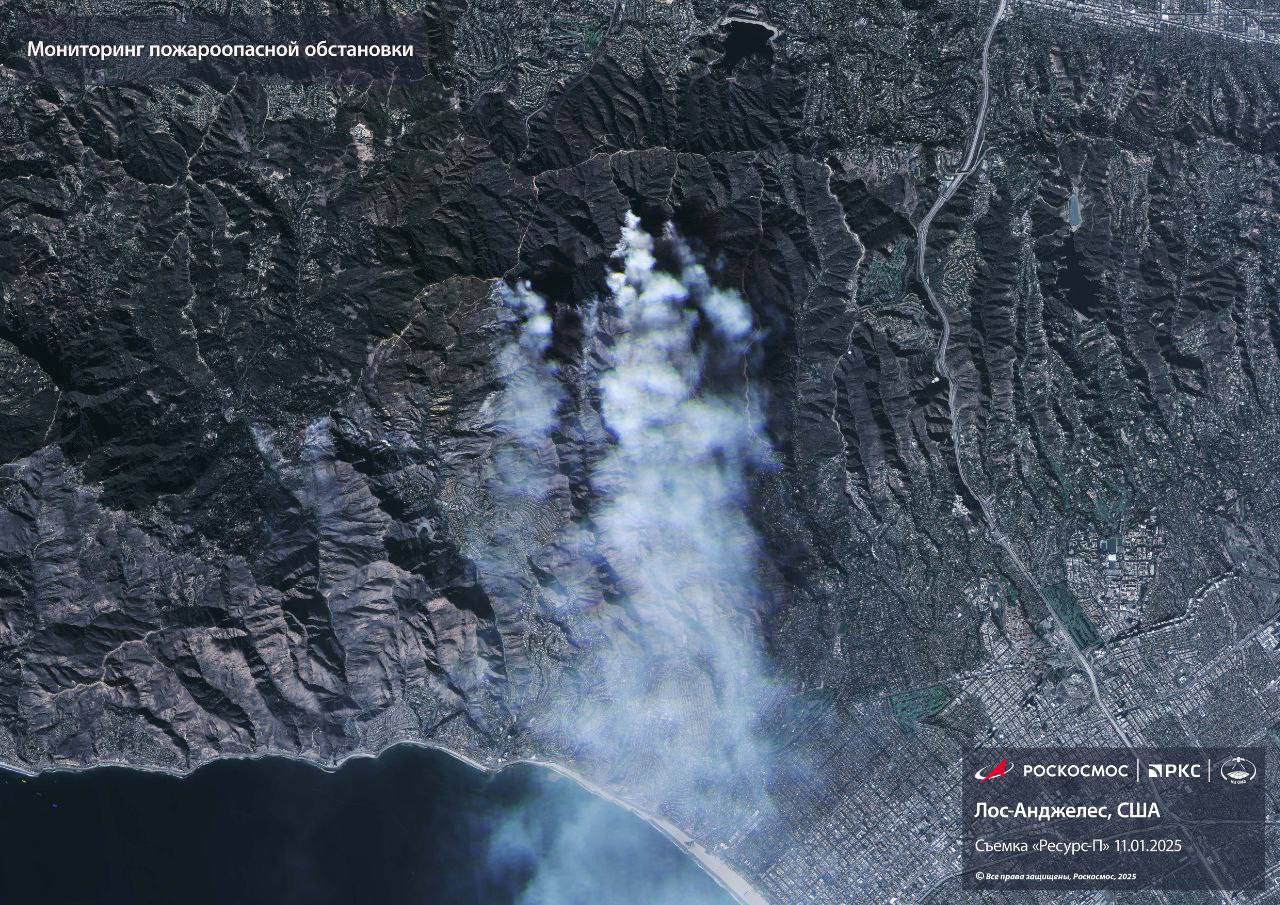 Общественности представлены новые фото пожара, который охватил округ Лос-Анджелес. Снимки опубликованы в Telegram-канале "Роскосмоса". Сделаны они со спутника "Ресурс-П".