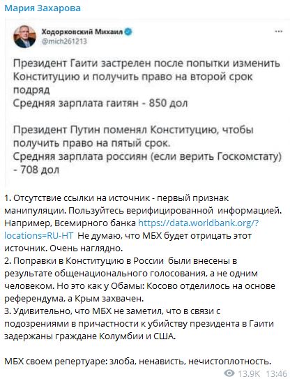 России можно, Гаити - нет. Захарова осадила Ходорковского, пытавшегося "разоблачить" Путина