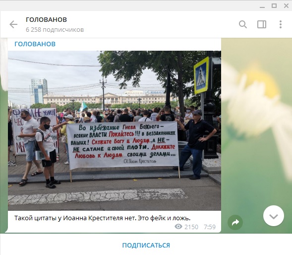 На митинге в поддержку экс-губернатора Хабаровского края Сергея Фургала развернули плакат с фейковой цитатой Иоанна Крестителя. "Хочется надеяться, что мы сможем извлечь урок из трагической ошибки XX столетия и не повторить её в веке XXI, избежать очередного забега по кровавым революционным граблям, сегодня обильно расставленным далеко не только в Хабаровске", - прокомментировал кощунственный фейк руководитель религиозной редакции Царьграда Михаил Тюренков.