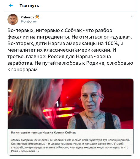 "Во-первых, интервью с Собчак - что разбор фекалий на ингредиенты. Не отмыться от "душка". Во-вторых, дети Наргиз американцы на 100% и менталитет их классически американский. И третье, главное: Россия для Наргиз - арена заработка. Не путайте любовь к Родине с любовью к гонорарам", - Priborov @priborov.