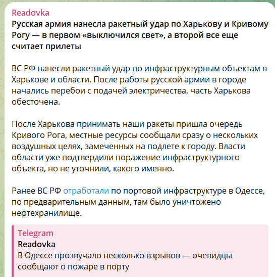Уже поздним вечером были зафиксированы серии "мощных ударов" по столице региона и на окраинах города. По предварительным данным, удары попали по тяжёлой военной технике и личному составу. В Харькове частично пропал свет.