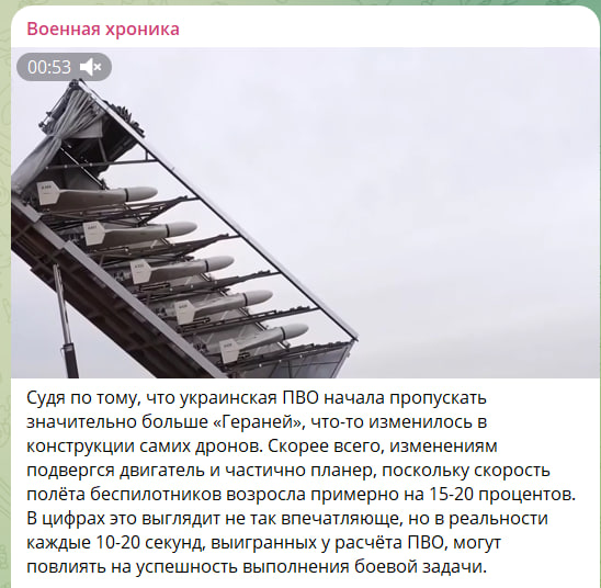 Также аналитики "Военной хроники" ранее писали, что, судя по тому, что украинская ПВО начала пропускать значительно больше "Гераней", что-то изменилось в конструкции самих дронов. Скорее всего, изменениям подвергся двигатель и частично планер, поскольку скорость полёта беспилотников возросла примерно на 15-20 процентов. В цифрах это выглядит не так впечатляюще, но в реальности каждые 10-20 секунд, выигранных у расчёта ПВО, могут повлиять на успешность выполнения боевой задачи.