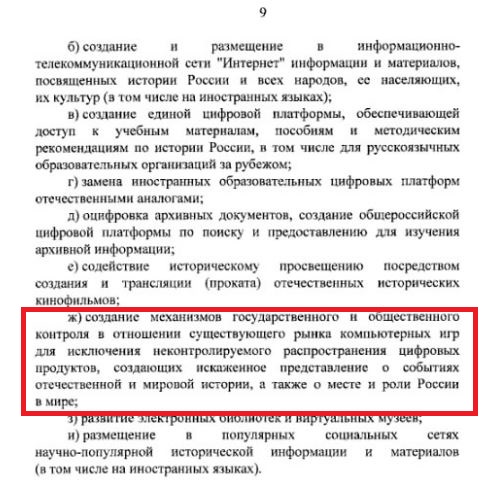 Документ опубликован на официальном сайте правовой информации. Один из его пунктов гласит: "Создание механизмов государственного и общественного контроля в отношении существующего рынка компьютерных игр для исключения неконтролируемого распространения цифровых продуктов, создающих искажённое представление о событиях отечественной и мировой истории, а также о месте и роли России в мире". Это означает, что Россия будет бороться с фальсификацией истории в видеоиграх.