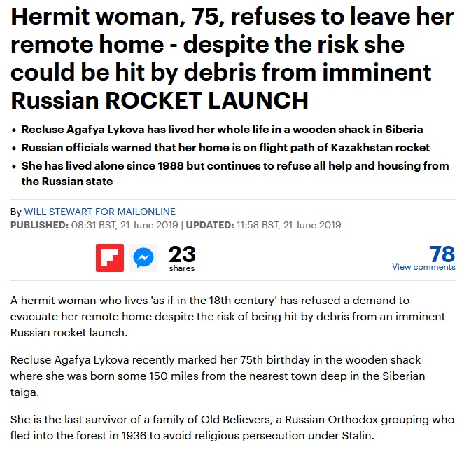 В материале речь идёт об Агафье Лыковой, которая проживает на территории заповедника "Хакасский". Пожилая женщина является единственной оставшейся в живых представительницей семьи староверов Лыковых, живших в изоляции с 1937 года. Её заимка располагается в районе, куда могут упасть отделяющиеся части ракеты-носителя после запуска с космодрома Байконур.