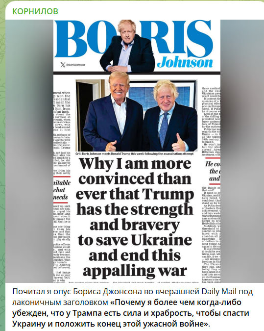 Невероятный лицемер, конечно! "Положить конец этой ужасной войне" призывает [тот, кто не дал] остановить эту войну в первые же недели после её начала! Причём теперь он говорит о том, что его устроят и границы 2022 года! <…> Что ж тебе мешало не вмешиваться в Стамбульский процесс и зафиксировать границы 2022 года?! Все бы тогда и прекратилось бы. А теперь начинается стадия торга, давно уже прошедшая! Самое забавное, что в этой же статье Джонсон фонтанирует идеями о том, как совместить намерение Трампа сократить американское присутствие в Европе с украинским кейсом…
