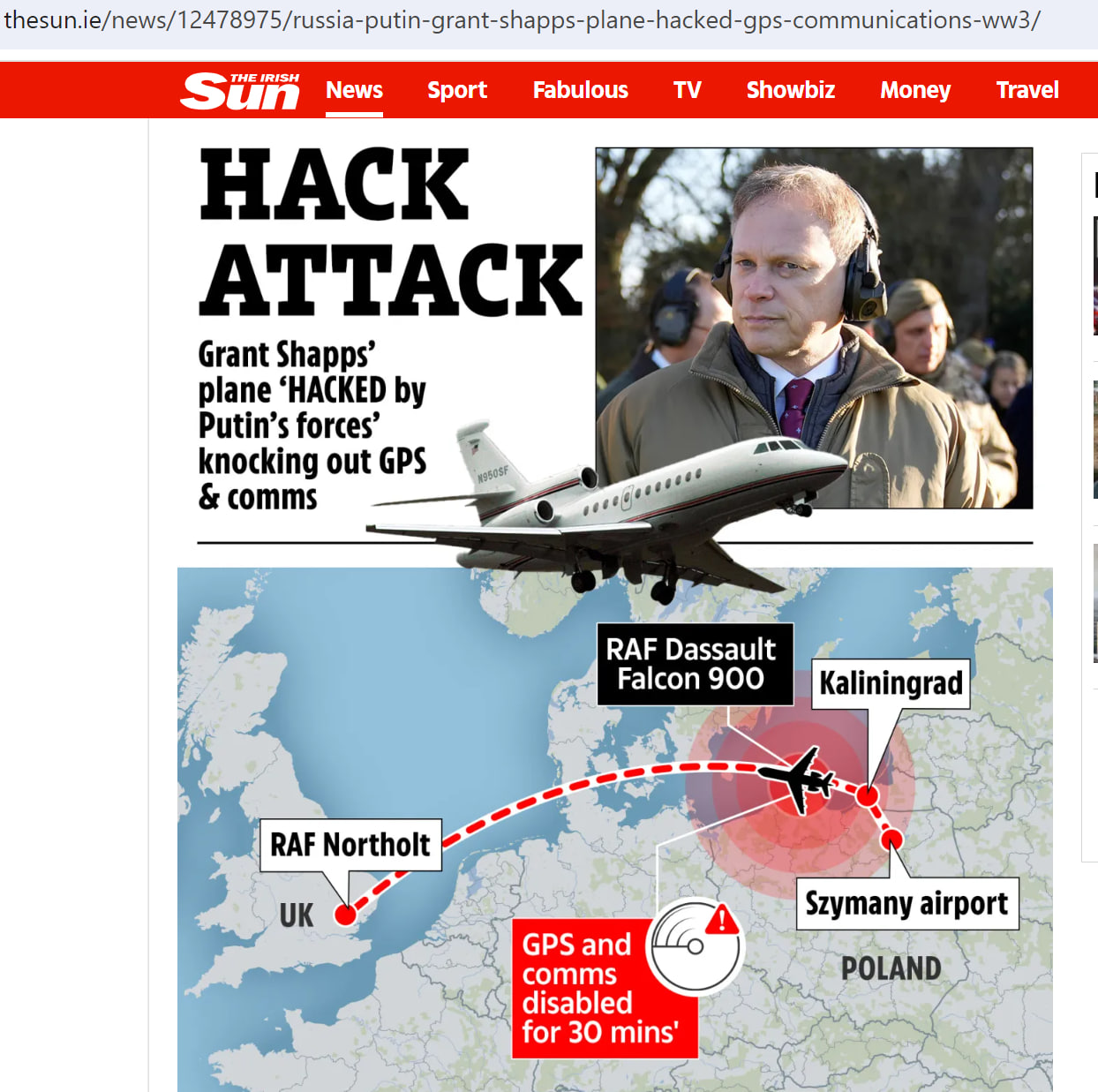 Так, в марте британские СМИ запестрели сообщениями, что самолёт британского министра обороны якобы потерял сигнал GPS недалеко от Калининграда. Сообщалось, что самолёт Dassault 900LX Falcon, в котором находился министр обороны Великобритании Грант Шаппс, на полчаса потерял сигнал GPS во время перелёта над Польшей вблизи Калининградской области. Инцидент, по утверждениям британской прессы, случился 14 марта, когда министр возвращался в Британию из Польши, где участвовал в контроле за учениями НАТО.