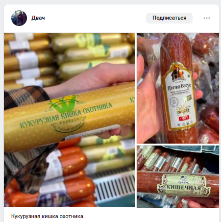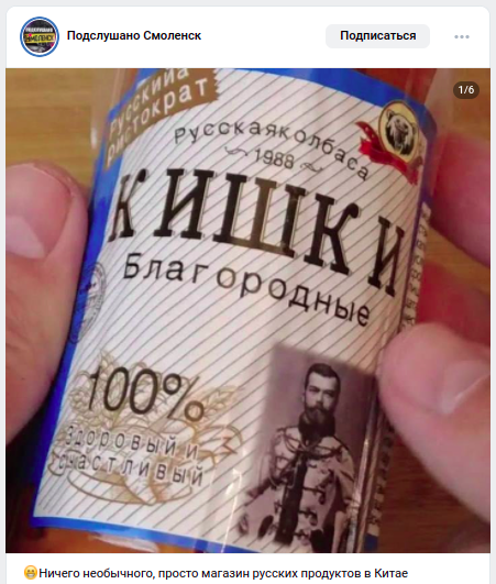 В Китае начали подделывать русские продукты с таким размахом, что в интернете уже завирусились фотографии самых курьёзных образцов. Например, колбаса "Кукурузная кишка охотника" с подписью "русская сосиска", "Кишки благородные" с изображением Николая II и слоганом "Русскийа аристократ!", а также "ПивоВкус" - полукопчёная колбаса с нарисованным медведем, держащим кружку пива.