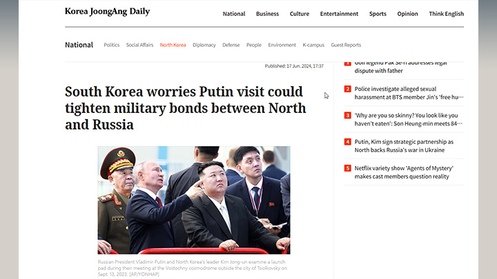 ЮЖНОКОРЕЙСКАЯ ГАЗЕТА JOONGANG ILBO ПУГАЕТ ЧИТАТЕЛЕЙ: РАЗВИВАЮЩЕЕСЯ ПАРТНЁРСТВО МОСКВЫ И ПХЕНЬЯНА В ВОЕННОЙ СФЕРЕ "УГРОЖАЕТ" СЕУЛУ. СКРИНШОТ СТРАНИЦЫ САЙТА ИЗДАНИЯ