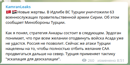О том же примерно у себя в Telegram-канале KamranLeaks пишет и журналист Камран Гасанов. Рассуждая о новых жертвах в Сирии, эксперт указывает на стратегию, которую избрала для себя Турция. Он отмечает, что на такие меры Анкара пошла, поскольку понимает, что Россия не позволит сдвинуть войска Асада.